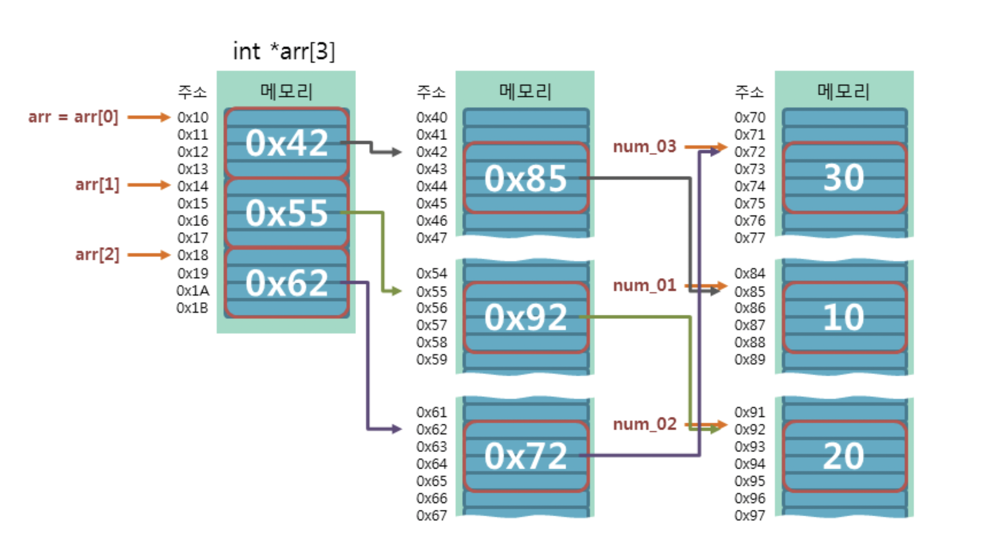Pointer Arrays: Arrays that have pointers(addresses) for its components. For example, if we have int *arr[3] = {&num01, &num02, &num03}, then it is pointer arrays.